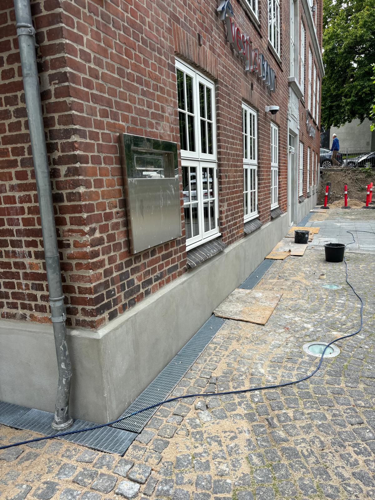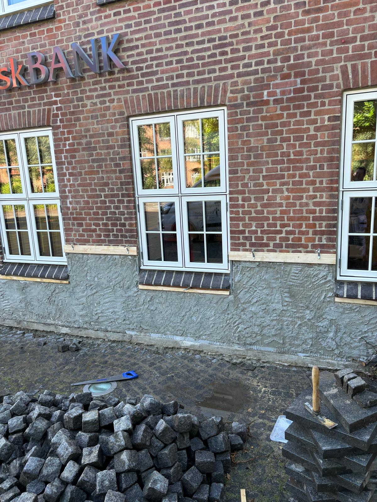 For Vestjysk Bank har vi netop udført reparation og pudsning af sokkel, samt andre pudset partier på bankens fredet ejendom midt i Aarhus C.
